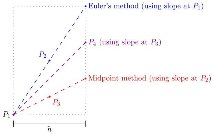 In RK2 the slope used to calculate the next point from a point is the slope at the midpoint between and the Euler’s method next step. In RK4, the slope used is a weighted average of the slopes at , , , and shown in the diagram above. Specifically, it is 1/6 of the slopes at and plus 1/3 of the slopes at and .