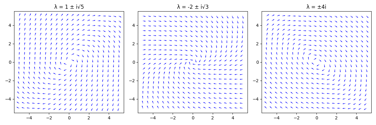 V \ [7;0]Today we talked about systems with complex eigenvalues. We started by looking at three different direction fields for the following three matrices: